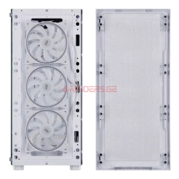 | 🌬 დამატებითი გაგრილება / გამყოფი სივრცეები | დამატებითი ფანების მხარდაჭერა — სულ 6×120 მმ: წინ — 3×120 + ზედა — 2×120 + უკანა — 1×120. რადიატორის მხარდაჭერა: წინა: 120/240/360 მმ; უკანა: 120 მმ. |